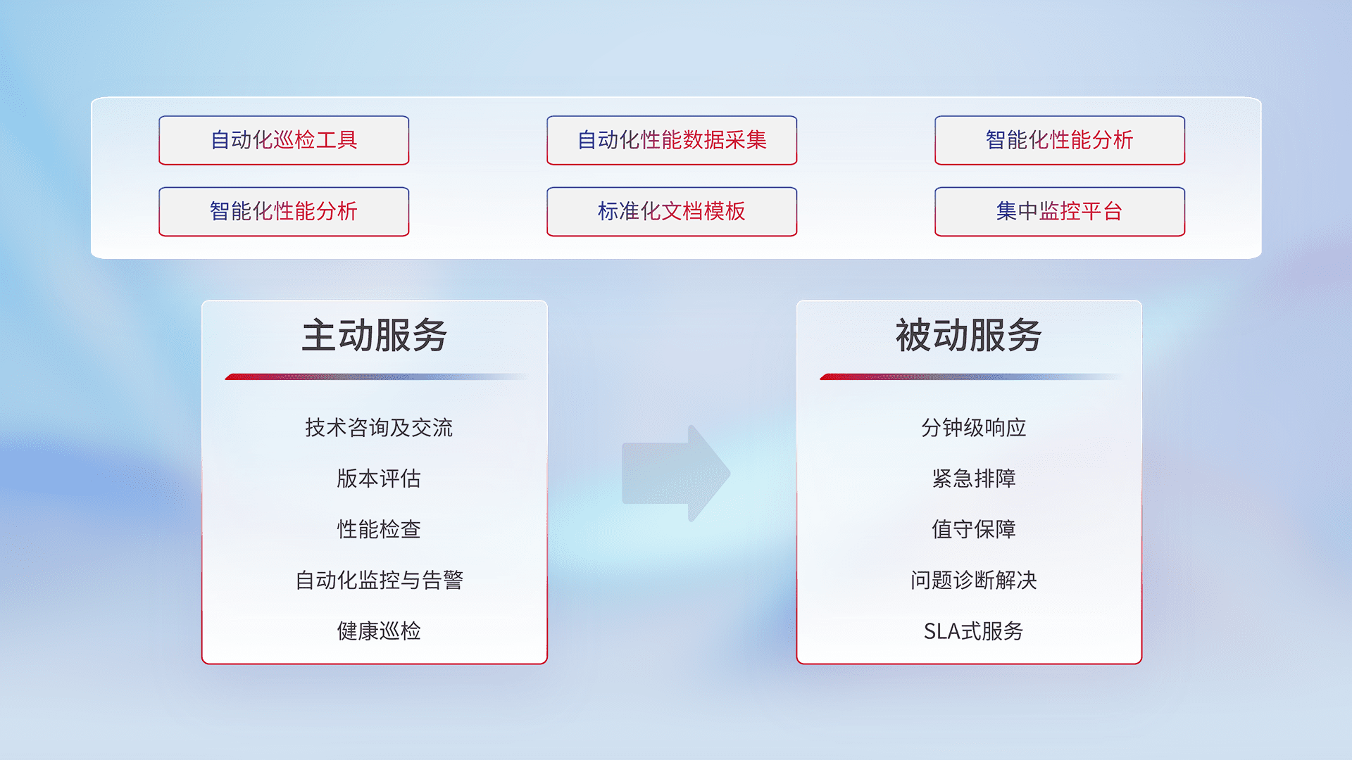 智能化工具和标准化文档,,,,保障服务质量,,提供主动服务(包含技术咨询、、、版本评估、、、、性能检查、、、自动化监控与告警、、、健康巡检)和被动服务包含(分钟级响应、、紧急排障、、值守保障、、、问题诊断解决、、SLA服务)。。