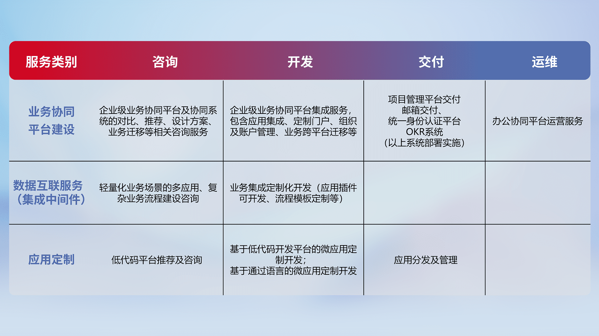 针对钉钉、、企微、、、、IDaas等平台级产品提供产品的规划、、、、方案、、、交付、、定制化开发等服务,,实现如统一协同办公、、、智能客户服务、、、混合会议管理、、智能数据查询、、、等业务场景,,,实现数字化转型。。。